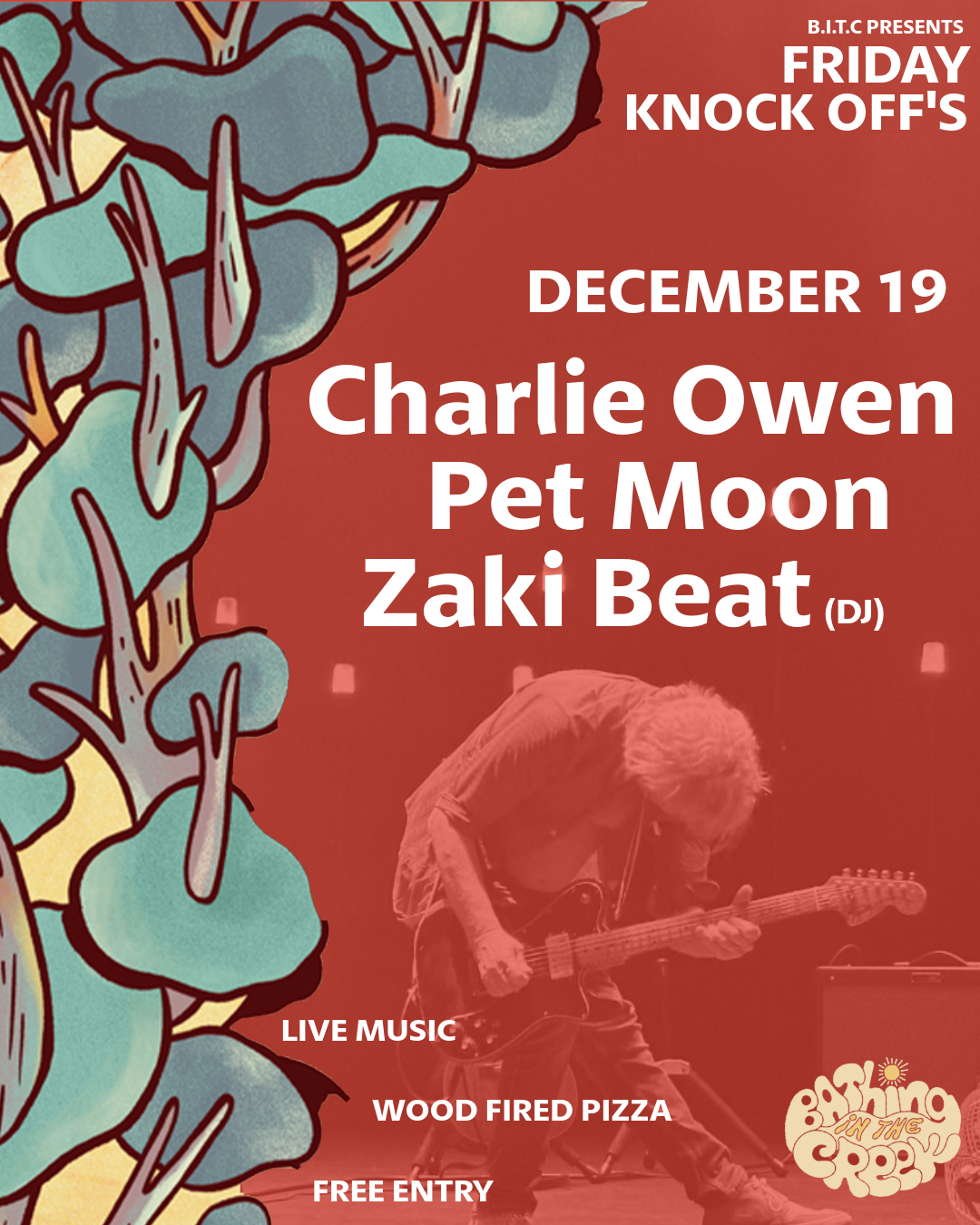 Join us for another round of Friday Knock Off's, this time it is a special Chrissy edition featuring three amazing artists! Charlie Owen's name runs deep through the bloodstream of Australian Music. Decades in he's carved out his sound with Tex, Don and Charlie. Beast of Bourbon, the New Christs and alongside Louis Tillet, Paul Kelly and the Working Class Ringos. His guitar cuts and comfort in the same breath - feral, tender and honest to the bone. Songs dripping with grit, grace and hard earned truth. Creatures crawl in from all corners to taste the heady brew that Pet Moon have been cooking on debut. These are liberated pets, unchained and spilling manic rock that shakes the dust loose and keeps nobody still. DJ Zaki Beat will be spinning tunes to close out the night and the working year!